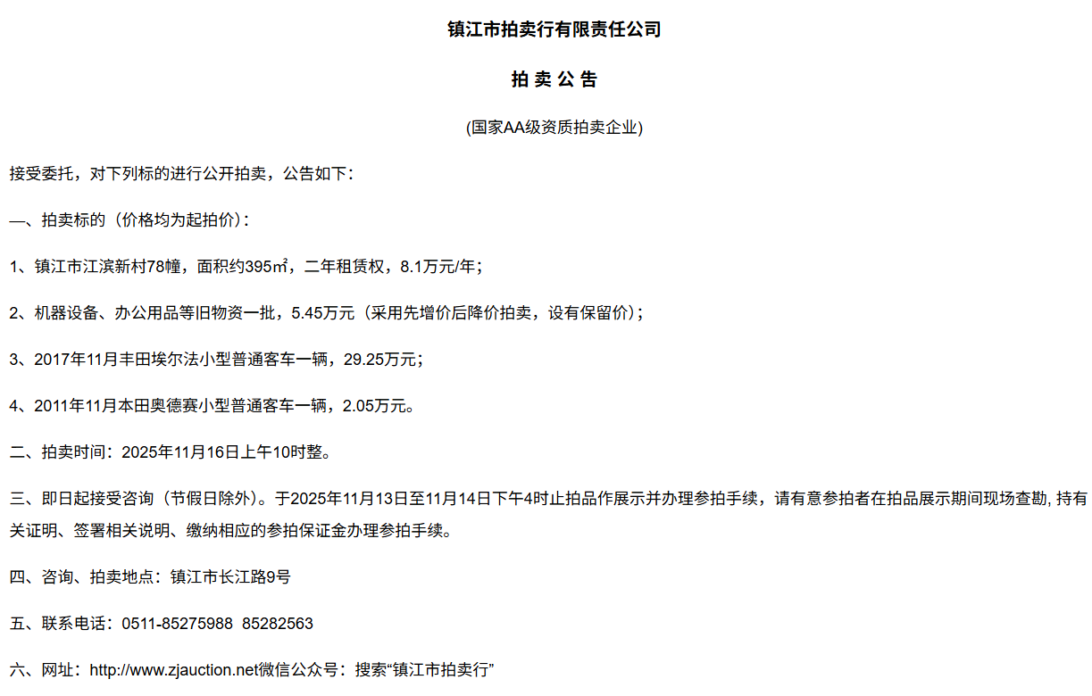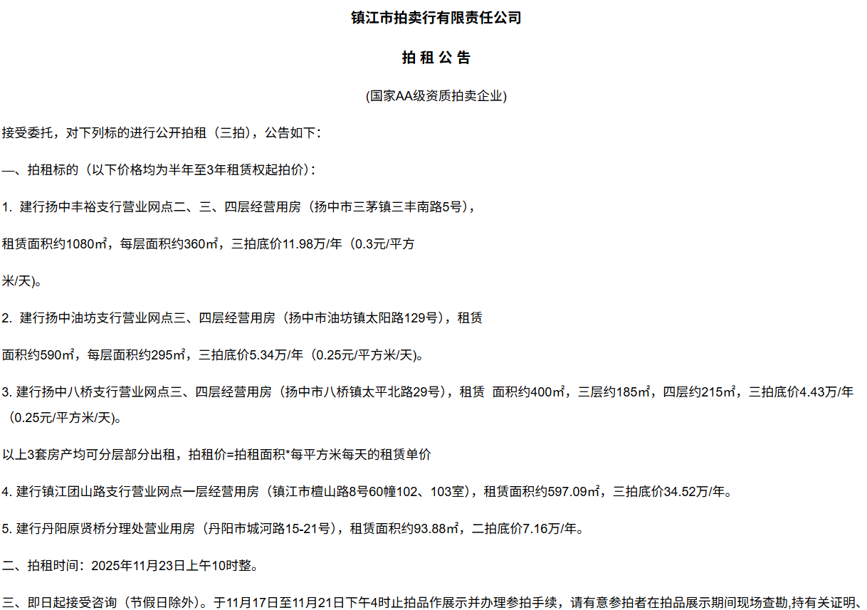 鎮江市拍賣行有限責任公司拍 租 公 吿(國家AA級資質拍賣企業)接受委托,對下列標的進行公開拍租(三拍),公告如下:—、拍租標的(以下價格均為半年至3年租賃權起拍價):1.  建行揚中豐裕支行營業網點二、三、四層經營用房(揚中市三茅鎮三豐南路5號),租賃面積約1080㎡,每層面積約360㎡,三拍底價11.98萬/年(0.3元/平方米/天)。2.  建行揚中油坊支行營業網點三、四層經營用房(揚中市油坊鎮太陽路129號),租賃面積約590㎡,每層面積約295㎡,三拍底價5.34萬/年(0.25元/平方米/天)。3. 建行揚中八橋支行營業網點三、四層經營用房(揚中市八橋鎮太平北路29號),租賃  面積約400㎡,三層約185㎡,四層約215㎡,三拍底價4.43萬/年(0.25元/平方米/天)。以上3套房產均可分層部分出租,拍租價=拍租面積*每平方米每天的租賃單價4. 建行鎮江團山路支行營業網點一層經營用房(鎮江市檀山路8號60幢102、103室),租賃面積約597.09㎡,三拍底價34.52萬/年。5. 建行丹陽原賢橋分理處營業用房(丹陽市城河路15-21號),租賃面積約93.88㎡,二拍底價7.16萬/年。二、拍租時間:2025年11月23日上午10時整。三、即日起接受咨詢(節假日除外)。于11月17日至11月21日下午4時止拍品作展示并辦理參拍手續,請有意參拍者在拍品展示期間現場查勘,持有關證明、簽署相關說明、繳納相應的參拍保證金辦理參拍手續。四、咨詢、拍租地點:鎮江市長江路9號五、聯系方式:0511-85275988   13655299933楊先生六、網址:http://www_zjauction_net.shoushenquan.com;微信公眾號:搜索“鎮江市拍賣行” 拍品清單2025.11.23序號名稱起拍價(元)標的說明1建行揚中豐裕支行營業網點二、三、四層經營用房(揚中市三茅鎮三豐南路5號),租賃面積約1080㎡,每層面積約360㎡三拍底價11.98萬/年(0.3元/平方米/天)1、1-3號房產均可分層部分出租,拍租價=拍租面積*每平方米每天的租賃單價;2、意向競拍人在拍賣前需持營業執照或身份證與委托方說明租賃房產經營業態,確定意向后出具房產承租用途承諾書,經委托方審核后,方可交納保證金參加競拍;3、租賃期限為半年至3年(承租方與出租方協商而定),承租方每半年或一年結付租金,租賃期間的水、電費用及其它相關費用均由承租方承擔;4、承租方不得用于經營和保管危險物品,不得用于開設餐飲、娛樂等可能嚴重影響消防安全、運營安全的經營業態,不得用于經營委托貸款、小額貸款等可能冒用委托方名義,帶來聲譽風險的經營業態。租賃期內,承租方不得破壞墻體結構,自行成就消防、安全等使用條件,不得擅自將租賃房屋轉租、轉讓給他人使用,否則委托方有權收回房屋;5、拍租成交后,承租方將租金交至出租方指定賬戶,傭金交至拍賣方賬戶(拍租傭金為該房屋一個月租金)。承租方憑租賃合同無息退還保證金。2建行揚中油坊支行營業網點三、四層經營用房(揚中市油坊鎮太陽路129號),租賃面積約590㎡,每層面積約295㎡三拍底價5.34萬/年(0.25元/平方米/天)3建行揚中八橋支行營業網點三、四層經營用房(揚中市八橋鎮太平北路29號),租賃面積約490㎡,每層面積約245㎡三拍底價4.43萬/年(0.25元/平方米/天)4建行鎮江團山路支行營業網點一層經營用房(鎮江市檀山路8號60幢102、103室),建筑面積約597.09㎡三拍底價34.52萬/年5建行丹陽原賢橋分理處營業用房(丹陽市城河路15-21號),建筑面積約93.88㎡二拍底價7.16萬/年